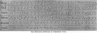 - «Треугольный алфавит» Джеймса Галла старшего, использующий прописные и строчные латинские буквы своеобразного начертания. Применён в 1826 году при создании первой англоязычной книги для слепых.