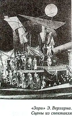 - ↑ Крупская Н. Постановка «Зорь» Верхарна (В театре б. Зона) // «Правда». — 1920. — С. 2.