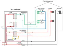 - Система отопления. Предназначена для обогрева помещений с целью поддержания в них заданной температуры воздуха[5]. Различают зависимые и независимые схемы присоединения систем отопления.