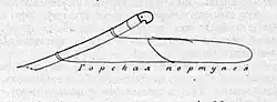 Не менее заслуживает внимание устройство ножен и плечевой портупеи. Первые вовсе не имеют металлического наконечника и на половину обёрнуты провощённой зелёной материей, абсолютно непромокаемой. В портупей обращает внимание задний пасик: он сравнительно очень длинный, потому что средний соединительный ремень прикреплён к нему не на высоте кушака, а выше вершков на пять (около 20 см). К ножнам он прикреплён так, что может скользить по ним[10]: