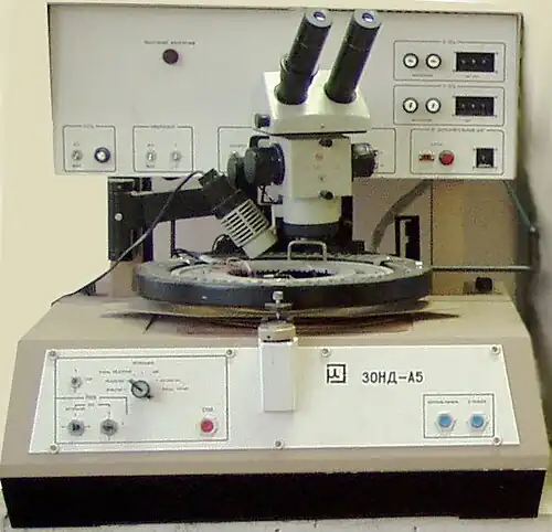 Тестировщик полупроводниковых пластин осуществляет испытание и разбраковку чипов на линии скрайбирования пластины. Некоторые компании получают большую часть информации о производительности устройств по результатам этих испытаний.[2]