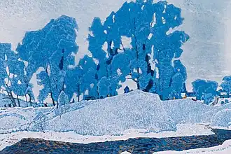 В известной картине «Русская зима. Иней»[53][54][55][56] (1969) старые тополя под пушистыми снеговыми шапками в голубоватом инее на берегу Мсты переданы Тимковым как воплощение красоты и величия русской природы. В ней, пожалуй, впервые столь отчетливо и убедительно проявилось новое качество в живописи художника — монументальность образного решения, возникшее после поездки годом ранее на Урал[57].