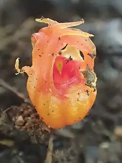 Это сапрофитное растение имеет красноватый, розоватый или розовато-белый цвет и растет в глубокой листовой подстилке. Корни редкие и ветвящиеся, с диаметром 1–1,5 мм и интервалом ветвления 10–20 мм. Чешуйчатые листья редкие, яйцевидные, с острыми концами, с тремя крупными ближе к цветку, размером 5 х 2 мм. Цветок достигает длины до 20 мм, одиночный и верхушечный, окрашен в красный, красно-оранжевый или иногда белый с оранжевой полоской. Трубка околоцветника имеет размеры 10 х 8 мм, раковинную форму и полупрозрачность. Внешние доли околоцветника узкотреугольные и могут быть прямостоячими или слегка изогнутыми, в то время как внутренние лопасти имеют размеры 4-5 х 2,5 мм и сросшиеся наверху, образуя митру с широкими отверстиями по бокам. Выступающий киль внутренней лопасти образует свободный придаток разной длины. Тычинки свисают с короткого, обычно красного кольца; свободные нити короткие и изогнутые; пыльники более широкие и срастаются в светлую трубку, доходящую до середины трубки околоцветника; пыльцевые мешки мелкие и широко расставленные; соединительные ткани тонкие и перепончатые, тщательно лопастные. Всего 6 нектарников, каждый из них находится под пыльниками и заключен в перепончатый мешочек. Завязь короткая, размером 1,5 х 2 мм, с вогнутой верхней поверхностью; стиль стаут, длиной 1 мм; рыльца усеченно-обратно-яйцевидные и двулопастные; семязачатки с длинными пучками, скученные на ножках-плацентах. Плоды мясистые, их верхняя часть становится желтоватой и прозрачной по мере созревания, обнажая многочисленные коричневые семена[4].