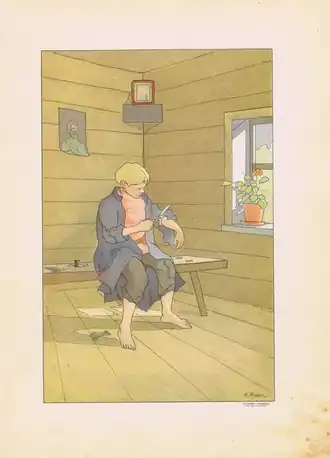 Этот вариант Иван Андреевич отложил, сочинив второй, в котором действующим лицом становится господин, у которого Тришка состоит в услужении: «У Тришки на локтю кафтан продрался. /„Подлец ты, пьяница, бездельник,— разъярясь / Кричит боярин (он был князь), / Чтоб эдак на глаза ты мне не попадался!“ / Мой Тришка за иглу принялся…»[2]