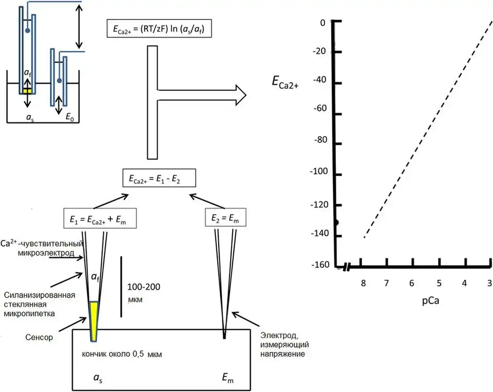 Экспериментальные данные, полученные с помощью оптимизированных электродов, удовлетворяли теоретически ожидаемому соотношению Нернста между выходным напряжением за вычетом одновременно записанных мембранных потенциалов и концентрацией свободного кальция вплоть до 1 мкМ в 0,1 М хлориде калия, с откликом, продолжающимся до 100 нМ [Ca2+] (рис. 1). Эти измерения согласовывались с данными, полученными путем уже устоявшейся люминесцентной спектроскопии в гигантских мышечных волокнах усоногих[13] и скелетных мышцах лягушки[14]. Измерения в последних были проведены с помощью флуорофора экворина, который содержит три Ca2+-связывающих EF-hand мотива. Экворин был получен из медузы Aequorea victoria, найденной в расположенной у западного побережья Северной Америки зоне Тихого Океана; вещество испускает флуоресцентную вспышку при возбуждении[15][16].