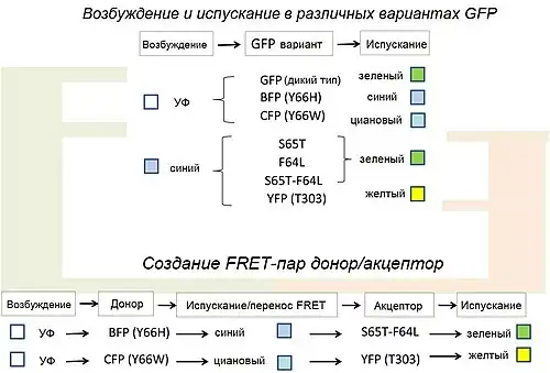 Характеризация части гена GFP Дугласом Прэшером[42] инициировала совместную работу в разных лабораториях. Роджер работал над производством и флуоресцентными свойствами GFP, используя Saccharomyces cerevisiae в сотрудничестве с Роджером Хеймом и Скоттом Эмр. Мартином Чэлфи (иностранный член Лондонского королевского общества, 2018) из штата Колумбия, который первый продемонстрировал УФ-индуцированную флуоресценцию GFP, введённого в клетки беспозвоночного, и предложил потенциальное применение белка как биомаркера, работал над его экспрессией в Escherichia coli и Caenorhabditis elegan. Исследования Тсиена привели к обнаружению мутанта Y66H (BFP) с улучшенной стабильной флуоресценцией в синей области спектра по отношению к исходным GFP дикого типа. Дальнейшие модификации белка, стереохимически разместившие триптофан, привели к появлению мутанта Y66W, кодирующего циановый флуоресцентный белок (CFP)[43][44] (рис. 6а). В паре FRET конформационные изменения структуры УФ-возбужденного BFP приводили к переносу энергии к GFP (рис. 6б). Это подразумевало способность GFP возбуждаться волнами синего диапазона спектра, которые испускал донор BFP. Однако в спектре возбуждения GFP был большой пик в УФ- и маленький пик в синей области. Проблема была решена созданием мутантного варианта GFP: нежелательный пик в УФ-области исчез, а синий возрос приблизительно в 5-6 раз с последующим сдвигом +10 нм после мутации S65T[44]. В попытке проверить гипотезу исследователи ввели пептидную связь между BFP и мутантом GFP-S65T, а также с другими мутантами, имеющие схожий с GFP-S65T профиль возбуждения. Селективное УФ-возбуждение BFP, в самом деле, приводило к различным типам испускания в зеленой и синей области в присутствии или отсутствии FRET-переноса до и после трипсинолиза белка. Дальнейшие испытания подтвердили, что S65T является оптимальным флуорофором при условии введении мутации F64L, обеспечивающей сохранение структуры и фолдинг при более высоких температурах[45]. Этот двойной мутант, называемый «улучшенный (S65T-F64L) GFP», в больших объемах производится компанией Clontech.