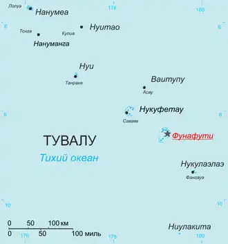 Полинезийское государство Тувалу представляет собой скопление из атоллов и островов, расположенных в Тихом океане немного южнее экватора. Столица страны, город-атолл Фунафути, расположен в 1050 км к северу от города Сува, столицы Фиджи, и в 4000 км к северо-востоку от Сиднея, крупнейшего города Австралии[8]. Ближайшие архипелаги — острова Гилберта, принадлежащие Республике Кирибати и расположенные к северо-западу от Тувалу, и острова Уоллис и Футуна, лежащие к юго-востоку и принадлежащие Франции.