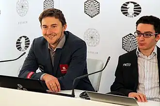 Сергей Карякин и Фабиано Каруана на пресс-конференции после последнего тура