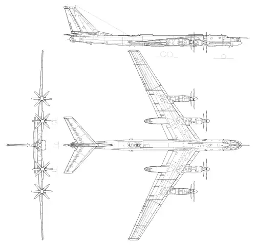 Примечание. Описание конструкции самолёта дано применительно к семейству «изделия В» — старым модификациям Ту-95М, КМ, РЦ и т. п. Эксплуатирующаяся в настоящее время модификация Ту-95МС (ВП-021) относится к семейству ВП (Ту-142) и в значительной степени отлична от снятых с вооружения предыдущих модификаций, так как самолёт создавался на базе противолодочного самолёта Ту-142М (ВПМ) и прототип носил название Ту-142МС. Планер и общесамолётные системы Ту-95МС во многом соответствуют противолодочной модели (см. техописание Ту-142).