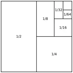 Сумма шести знаков, входящих в Уаджет, и приведённых к общему знаменателю: 32/64 + 16/64 + 8/64 + 4/64 + ²/64 + 1/64 = 63/64