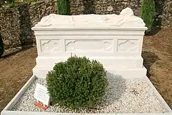 (Перевод: «Её друзья соорудили этот фонтан в месте её рождения. Пусть Божьи создания, которых она так любила, успокоят её нежную душу, придя сюда напиться».)