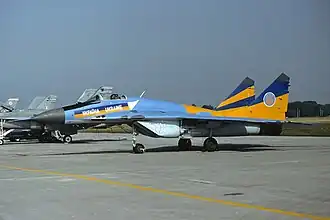 ![]() МиГ-29 раскрашенный в цвета пилотажной группы «Украинские Соколы» в 1997 году. | |