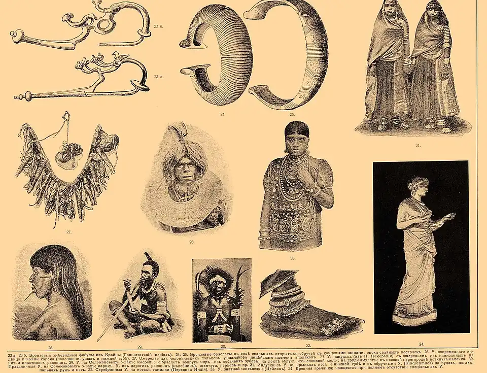 23а, 23б. Бронзовые змеевидные фибулы из Крайны (Гальштатский период). 24, 25. Бронзовые браслеты в виде овальных открытых обручей с концевыми шипами, эпохи свайных построек. 36. Украшения современного индейца племени каройа (палочки в ушах и нижней губе).ж 27. Ожерелье из человеческих пальцев индейца племени арапахо. 28. Украшения папуасца (из Нижней Померании) с ожерельем из нанизанных на нитки пластинок раковин. 29. Украшения на Соломоновых о-вах; ожерелье и браслет вокруг икр из собачьих зубов; на локте обруч из слоновой кости; на груди амулет; в носовой перегородке воткнута палочка. 30. Праздничные украшения на Соломоновых о-вах; парик, украшения из дорогих раковин (налобник), жемчуга, перьев и пр. 31. Индуски с украшениями в крыльях носа и нижней губе и с обручными украшениями (Ringschmuck) на руках, ногах, пальцах рук и ног. 32. Серебряные украшения на ногах тамилки (Передняя Индия). 33. Украшения знатной сингалезки (Цейлон). 34. Древняя гречанка; изящество при полном отсутствии специальных украшений