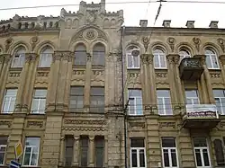 Между окнами первого этажа изображены лопасти с ленточной рустикой, оживляющей плоскость стены игрой светотени и создающей впечатление массивности здания. Верхний пролёт занимает третий и четвёртый этажи. Межоконные проёмы выделяют спаренные полуколонны с капителями, украшенными виноградным орнаментом. В округлых нишах между арочными окнами поочередно повторяются скульптурные головы мужчины и женщины. Окна на выступах в стене, более тесно сгруппированные и обрамленные общим бордюром, подчеркнуты пилястрами. Над арочными окнами четвёртого этажа размещены характерные для неоготического стиля розетки. Ступенчатые парапеты выступов украшены полукруглыми нишами, картушами, поставленными под углом башенками с зубчиками. Среднюю изогнутую часть фасада завершает парапет с прямоугольными нишами и зубчиками (сохранились не полностью).