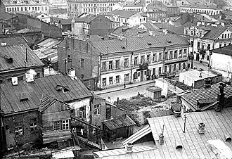 ![]() Вид с путепровода (ул. Ленина — пр. Победителей) на юго-запад. Справа (чётная сторона) видна застройка 1970-х — 1980-х годов, собор Петра и Павла (XVII век), фрагмент горельефа «Солидарность» | |
