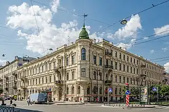7831893000 — дом В. П. Лихачёва (1 четв. XIX века; 1881, архитектор П. П. Мижуев). Здание было надстроено до пяти этажей по проекту архитектора Л. Л. Фуфаевского в духе поздней эклектики. В этом здании проживали поэтесса Зинаида Гиппиус с мужем Дмитрием Мережковским, Дмитрий Философов, Иван Соллертинский[16].