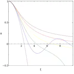 где — безразмерный радиус, связано с плотностью и, следовательно, с давлением, соотношением для центральной плотности . Показатель является индексом политропы, упоминаемым в политропном уравнении состояния