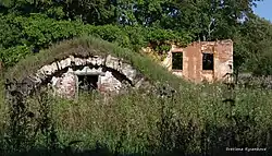Третья зона, в которой сосредоточены хозяйственные постройки, находится в северной части усадьбы. Видимо, в XIX в. построек было гораздо больше, а до наших дней дошли зернохранилище, выстроенное в стиле позднего классицизма, кузница, конюшня, погреб, винокуренный завод и две деревянные на кирпичных столбах хозяйственные постройки[3].