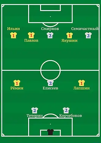 | «Динамо» Москва: Квасников - Тетерин, Корчебоков - Лапшин, Елисеев, Рёмин - Семичастный, Якушин, Смирнов, Павлов, Ильин «Динамо» Пятигорск: Айвазов - Бобрыш, Федорков - Бутник, Бойко, Сухарев - Гавашели, Пивоваров, Мотлохов, Сидоров, Балаба |