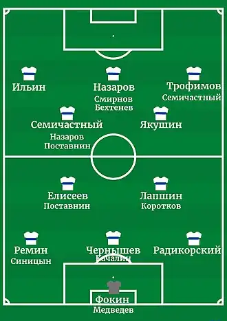 | «Динамо» Москва: Фокин - Радикорский, Чернышев, Богданов - Качалин, Елисеев - Трофимов, Смирнов, Назаров, Поставнин, Ильин |