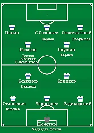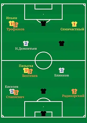 | «Динамо» Москва: [7]Кочетов - Радикорский, Чернышев, Станкевич - Блинков, Палыска - Семичастный, Якушин |