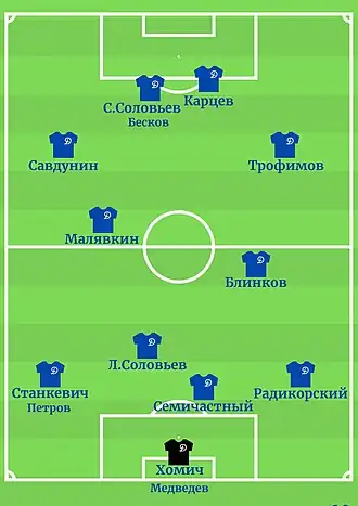 | «Динамо» Москва: Хомич - Радикорский, Семичастный ЦДКА: Никаноров - Лясковский, Кочетков, Прохоров - И.Щербаков, Афанасьев - Гринин, Николаев, Федотов |