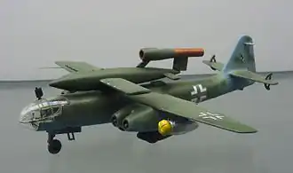 • с самолёта-носителя, в качестве которого использовался бомбардировщик He 111[5]. Снаряд подвешивался к носителю асимметрично — под одно крыло рядом с фюзеляжем, что объясняется сильно выступающим над корпусом снаряда двигателем.