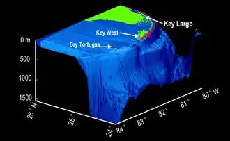 Флоридский риф состоит из двух хребтов, отделённых от архипелага каналом Хоук. Ближе всего к Флорида-Кис находится песчаная гряда под названием «Белый берег» с большими зарослями морской травы и отдельными рифами, разбросанными по всей территории. Дальше, в море, на краю Флоридского пролива, находится второй хребет внешних рифов и побережья, состоящего из кораллового щебня и песка.