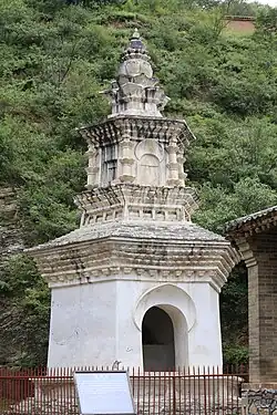 В основании храма имеются два погребальных столба времен империи Тан. Самый ранний, высотой 3,24 метров, был поставлен в 857 году, одновременно со строительством восточного зала.[3]
