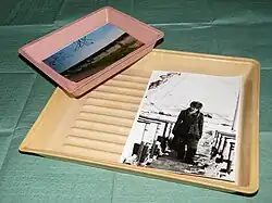 Печать может выполняться на позитивные фотоматериалы разных типов: фотопластинки, фотоплёнку и фотобумагу[49]. В первых двух случаях в результате печати получают диапозитивы, пригодные для рассматривания в проходящем свете, то есть проекции на экран и оформления световых коробов. Наибольшее распространение получила печать на фотобумаге, снимки на которой не требуют специальной задней подсветки и удобны для рассматривания в отражённом свете. Различают ручную и машинную печать. При ручной печати разрезка фотоматериала, его экспонирование и проявка производятся фотолаборантом без автоматических приспособлений. Лабораторная обработка фотобумаги в этом случае производится в кюветах, реже в полуавтоматических процессорах барабанного типа[50].