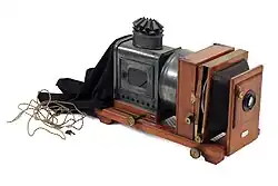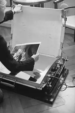 В первые годы для увеличения негативов чаще всего использовали фотоаппарат, кадровое окно которого освещалось проекционным фонарём или просто дневным светом, направляемым отражателем через отверстие в стене затемнённой фотолаборатории[22]. Негатив размещался с внутренней стороны матового стекла, и проецировался объективом на закреплённую на стене фотобумагу. Иногда для увеличения использовались два фотоаппарата разных форматов, установленные друг напротив друга. Объектив одного из них вынимался, а в кассету заряжалась фотобумага, на которую другой камерой проецировался негатив[23]. При тщательной светоизоляции стыка между объективными досками фотоаппаратов такая установка позволяла вести печать в незатемнённом помещении светом из окна, отражённым от рассеивателя. Некоторые фирмы выпускали готовые увеличители аналогичной конструкции[24]. В крупных фотостудиях устанавливали горизонтальные проекторы с угольной дуговой лампой. Знакомые современным фотографам вертикальные фотоувеличители с лампой накаливания появились только в начале 1930-х годов, и одной из первых такие приборы начала выпускать фирма Ernst Leitz в качестве дополнительного оборудования к малоформатным фотоаппаратам «Leica»[25].