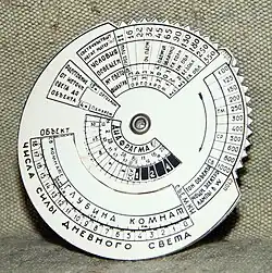 Указанное стрелкой значение переводится в экспозиционные параметры с помощью так называемого калькулятора, который представляет собой набор соосных поворотных дисков со шкалами светочувствительности, диафрагмы, выдержки и частоты киносъёмки[15]. При установке исходных параметров и результата замера происходит их относительное вращение, совмещающее правильные экспопары на дисках выдержек и диафрагм. В некоторых экспонометрах (например, «Свердловск-4») калькулятор автоматически устанавливается в правильное положение при достижении «нулевой» индикации. Все полученные экспопары обеспечивают правильную экспозицию в соответствии с законом взаимозаместимости. Аналогичное устройство имеют встроенные несопряжённые экспонометры фото- и кинокамер.