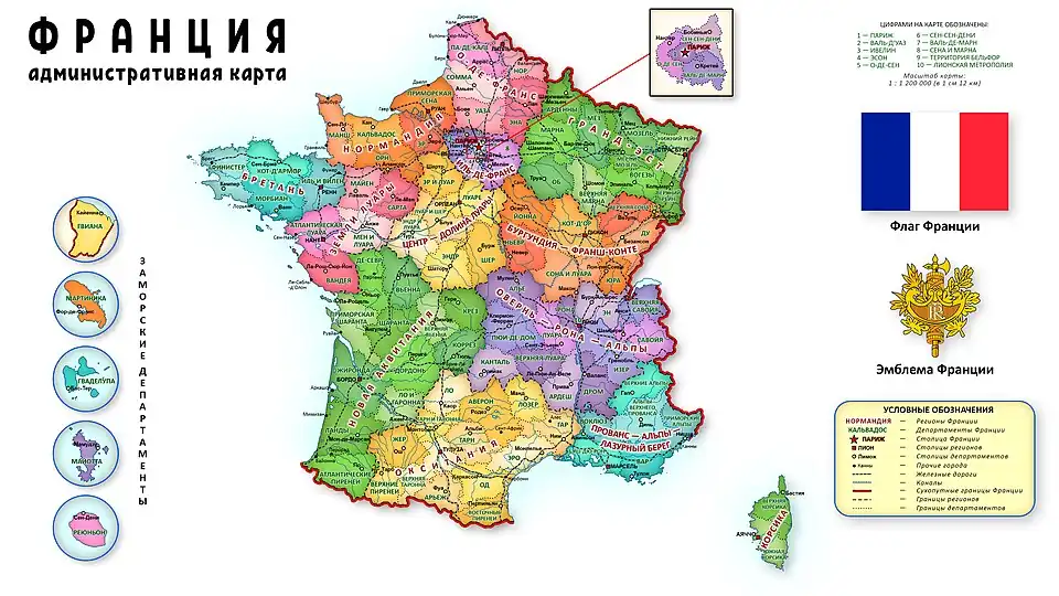Законодательный орган — двухпалатный парламент (Сенат и Национальное собрание). Административно-территориальное деление: 18 регионов (13 в метрополии и 5 заморских регионов), включающих 101 департамент (96 в метрополии и 5 заморских департаментов)[13], 5 заморских сообществ и 3 административно-территориальных образования с особым статусом.