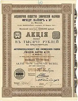 Акция в 1000 руб. на предъявителя Акционерного общества химической фабрики Фридр. Байер и Ко в Москве. Москва, 1912 г.[2]