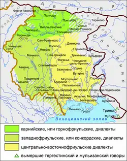 Фриульскому языку присуща высокая диалектная дробность. Фриульские диалекты группируются в три основных ареала: карнийский, западнофриульский и центрально-восточный фриульский[10].