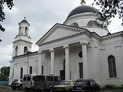 Храм в стиле зрелого классицизма. В плане храм имеет форму латинского креста. Боковые фасады украшены четырёхколонными портиками. У церкви двойной купол, обе оболочки купола с окошками. Внутренняя оболочка с круглыми окошками, а наружная — с полукруглыми, через которые видно внутренний купол.