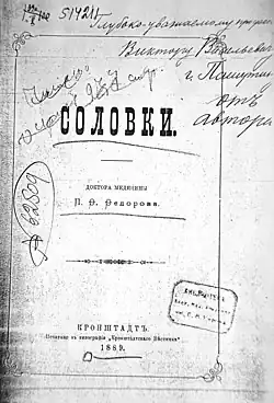 Вследствие, проходя службу в Кронштадте, П. Ф. Фёдоров обобщил собранный материал в своей книге «Соловки».