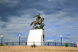С идеями хазарского мифа связан памятник князю Святославу (2005) работы скульптора Вячеслава Клыкова: на щите поверженного хазарского воина изображена звезда Давида, на щите князя — неоязыческий и неонацистский символ «коловрат» (восьмиконечная свастика)[8]. Композиция в целом является отсылкой к изображению Георгия Победоносца, который побеждает змея-Сатану. Установка памятника была привязана к «Дню победы Святослава над иудейской Хазарией». Предполагалось, что он станет местом собраний сторонников «борьбы с хазарами», но памятник был установлен в отдалённой местности, в селе Холки Белгородской области. Другой памятник Святославу работы Клыкова установлен в Запорожье (2005). Ряд памятников этому князю установлены в других регионах или предлагаются к установке[19].