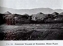Деревни на равнине, по-видимому, были по большей части армянскими, но в некоторых армянских деревнях частично проживают курды. Мы остановились перекусить в одном из крупнейших из них, армянском поселении Хаскёй. Это типичное армянское жилище, напоминающее ряд муравейников; но на моем рисунке нет группы вековых деревьев, которые примыкают к нему, - необычного ориентира на этом пространстве. В Хаскёе насчитывается не менее 300 домов и 2 церкви, а также руины более древних святилищ. Но школа была закрыта по приказу правительства, и только один процент крестьян умел читать и писать. Священник показался мне невежественным человеком; бедняга, его недавно посадили в тюрьму по обвинению в неуплате налогов. Если бы только армянские патриоты позаботились о реформе сельского духовенства, какой неоценимый урожай собрала бы наша нация! Жители деревни являются хорошим примером армянского крестьянства – такие широкие плечи и массивные бедра! Они были довольно состоятельными людьми, некоторые из них жили в достатке. Их решительный вид производит впечатление. Хаскёй раскинулся на открытой местности посреди просторной равнины, в то время как Муш приютился под стеной южного горного хребта.[1]