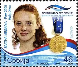 Почтовая марка Сербии 2009 года, посвящённая сербской пловчихе-брассистке, чемпионке мира 2009 года на дистанции 200 м. Наде Хигл