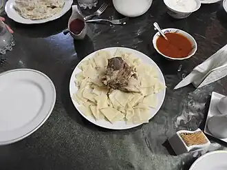 Варят баранину или говядину. Тесто тонко раскатывается и нарезается небольшими квадратами. Затем варится в мясном бульоне, подается на стол в горячем виде, с мясом, аджикой, и томатным (чесночным) соусом. В конце трапезы в пиалах подается бульон[11].