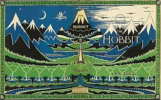 В июле 1937 года Толкин представил издательству собственные проекты обложки и суперобложки для книги[86]. Рисунок для обложки включает в себя изображения дракона, гор, солнца и луны. Две руны ᚦ (TH) обозначают имена королей Трора и Траина, а руна ᛞ (D), предположительно, указывает на прародителя гномов Дурина. Суперобложка даёт читателю представление о месте действия книги — на ней изображены горы, лес, город на Долгом озере, Одинокая Гора, дракон и орлы. Одновременное присутствие на небе солнца и луны указывает на день Дурина, во время которого появлялась возможность открыть потайную дверь в Одинокой Горе. Обрамление суперобложки выполнено в виде надписи англосаксонскими рунами: «„Хоббит, или Туда и обратно“ — сочинение Бильбо Бэггинса из Хоббитона о его путешествии, длившемся год, — обработано на основе его воспоминаний Дж. Р. Р. Толкином и опубликовано George Allen and Unwin Ltd.». Оба проекта издательством были приняты[87][39].