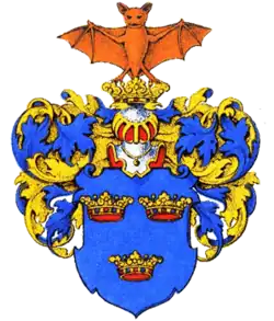Щит увенчан коронованным дворянским шлемом. Нашлемник — летучая мышь с распростертыми крыльями (натурального цвета — коричневая). Намет голубой с золотом.
