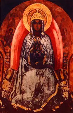 - Эскиз композиции «Царица Небесная на берегу Реки Жизни» вызвал восхищение Максимилиана Волошина. Он так описал его: «Пламенные, золотисто-алые, багряные, рдяные сонмы сил небесных, стены зданий, развёртывающихся над облаками, посреди них Царица Небесная в белом платье, а внизу неяркий земной облачный день и студёные воды будничной реки жизни… Белая ли одежда Богоматери среди пурпурных сонмов, или теснота сил небесных над тусклым простором земли дают это впечатление, но в этой иконе почувствовано [так в тексте] нечто очень древнее и восточное»[75]). Впервые изображение Царицы Небесной появилось у Рериха в 1906 году[67][76], когда востоковед и путешественник Виктор Голубев предложил ему расписать церковь Покрова Богородицы в селе Пархомовка. Для этого храма художник создал первый эскиз алтарного образа «Царица Небесная». Замысел не был воплощён. Брат заказчика Лев отказался от эскизов художника во внутренней росписи церкви под предлогом их несоответствия церковному канону[76]. В алтарной росписи талашкинского храма одежду Богородицы художник украсил зооморфными и растительными фигурами, символами и орнаментом с резьбы Дмитровского собора во Владимире[50].