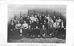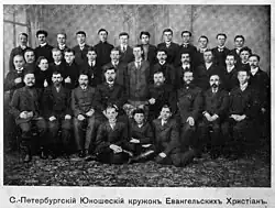 | 3 | Второй съезд Евангельского союза христианской молодёжи[17][18] | 1909 год, 17-19 мая, Санкт-Петербург | И. С. Проханов | Конфессиональный состав: евангельские христиане. Принят Устав Союза молодежи и типовой устав молодёжного кружка при церкви. Решено легализовать Союз под названием «Евангельский союз христианской молодежи». Председателем Союза избран И. С. Проханов, секретарём - Я. И. Жидков. | ![]() |