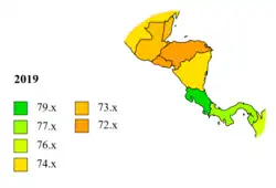 | Мир | 73,33 | 70,95 | 75,84 | 4,89 | 71,78 | 1,09 | 72,87 | −0,68 | 72,18 | −0,97 | 71,22 | 1,75 | 72,97 | 0,36 | 73,33 | 0,46 | 1,55 |