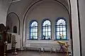 Храмовая часть на северной и южной сторонах образует выступы, завершённые аттиками. Её увенчание — вытянутый купол на отмеченном тем же вертикализмом барабане, который прорезан высокими арочными окнами. Барабан алтарного купола также восьмигранный, но широкий и низкий, а его окна квадратные. Кроме того, в основании этого купола фальшивые люкарны[1].