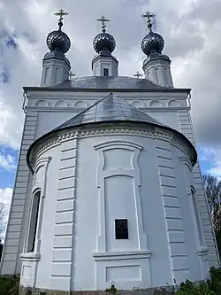 Церковь представляет собой пятиглавый бесстолпный четверик. Его архитектура наследует барокко: рустованные лопатки, наличники в апсиде и храмовой части, идущие от образцов наличников «с ушами» XVIII века. В целом, стоит отметить, что наиболее приемлемым и распространенным для данной области оказался разработанный в ярославском и костромском зодчестве второй половины XVII века тип бесстолпного пятиглавого храма, перекрытого сомкнутым сводом, в соединении с пониженной трапезной и примыкающей к ней колокольне[2].