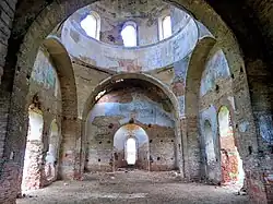 Колокольня снизу разделялась перегородками на коридор, ведущий в церковь и служебное помещение. Интерьер молитвенного зала гармонизирует с венчающим в его центре широким куполом. Храм был покрыт росписями, их фрагменты сохранились в алтарной апсиде и в центре на поддерживающих пандативах. Перед северным и южным входами были широкие четырехколонные портики дорического ордера, гармонирующие с расположенными по сторонам в дверных и оконных проемах пилястрами.