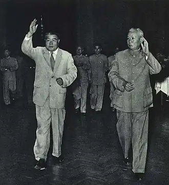 Чхве Ён Гон (слева) с председателем Китайской Народной Республики Лю Шаоци (справа) во время его официального визита в Пекин 5 июня 1963 года.